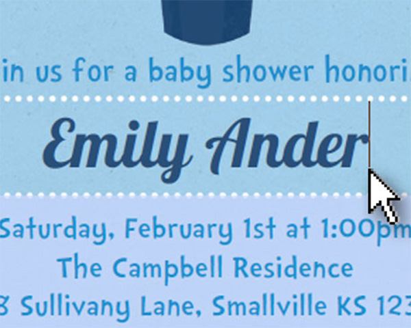 Simply replace the text in the text fields with your own. If you want more control over the text formatting, press “CTRL+E” (or Command+E on a Mac) to bring up a toolbar for additional text editing options, such as sizing.