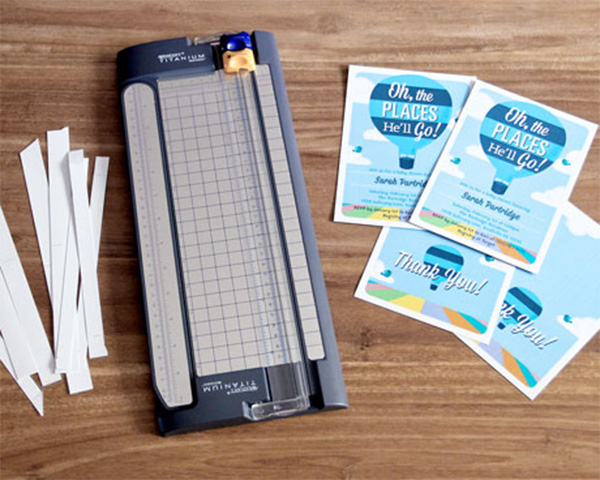 Armed with a paper trimmer or scissors, you will be an unstoppable invite making machine! The custom invite templates have trim guides, making this part easy peasy. Depending on the quantity, you should be done in 10 minutes or less!